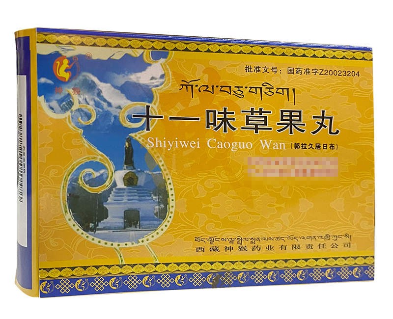 十一味草果丸的功效与作用:健脾。用于寒热脾症引起的腹胀肠鸣,肝区疼痛、唇舌发紫、消化不良、矢气频频。十一味草果丸主要成份:草果、紫草茸、藏茜草、诃子、麻黄、川木香、豆蔻、土木香、丁香、波棱瓜子、荜茇。 十一味草果丸的服用方法:一次4~5丸,一日2~3次。
